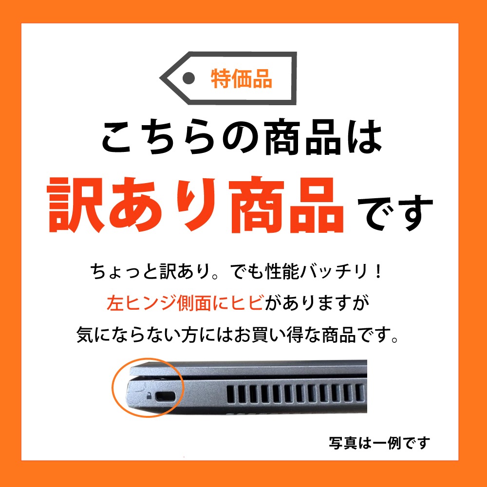 | ご注意 | ・左ヒンジ側面にヒビがあります。 ・中古品のため、バッテリーは保証外となります。ACアダプタを接続してご使用ください。 ・本体に擦り傷や日焼けなど多少の使用感がございます。 ・OSは中古PC再生用にインストールされたものであり、メーカー出荷時とは内容が異なります。 |