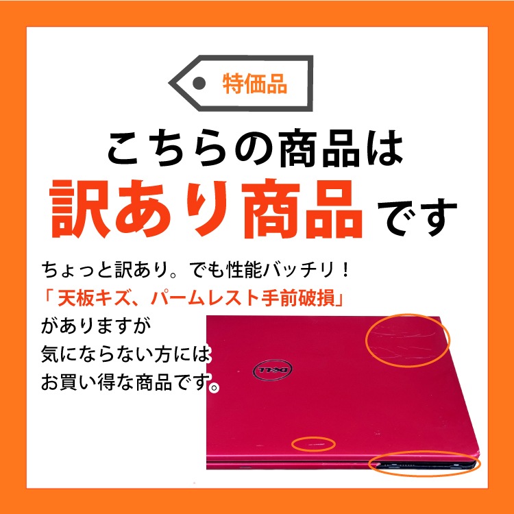 | ご注意 | ・天板にキズ・パームレスト手前破損があります。 ・中古品のため、バッテリーは保証外となります。ACアダプタを接続してご使用ください。 ・本体に擦り傷や日焼けなど多少の使用感がございます。 ・OSは中古PC再生用にインストールされたものであり、メーカー出荷時とは内容が異なります。 |