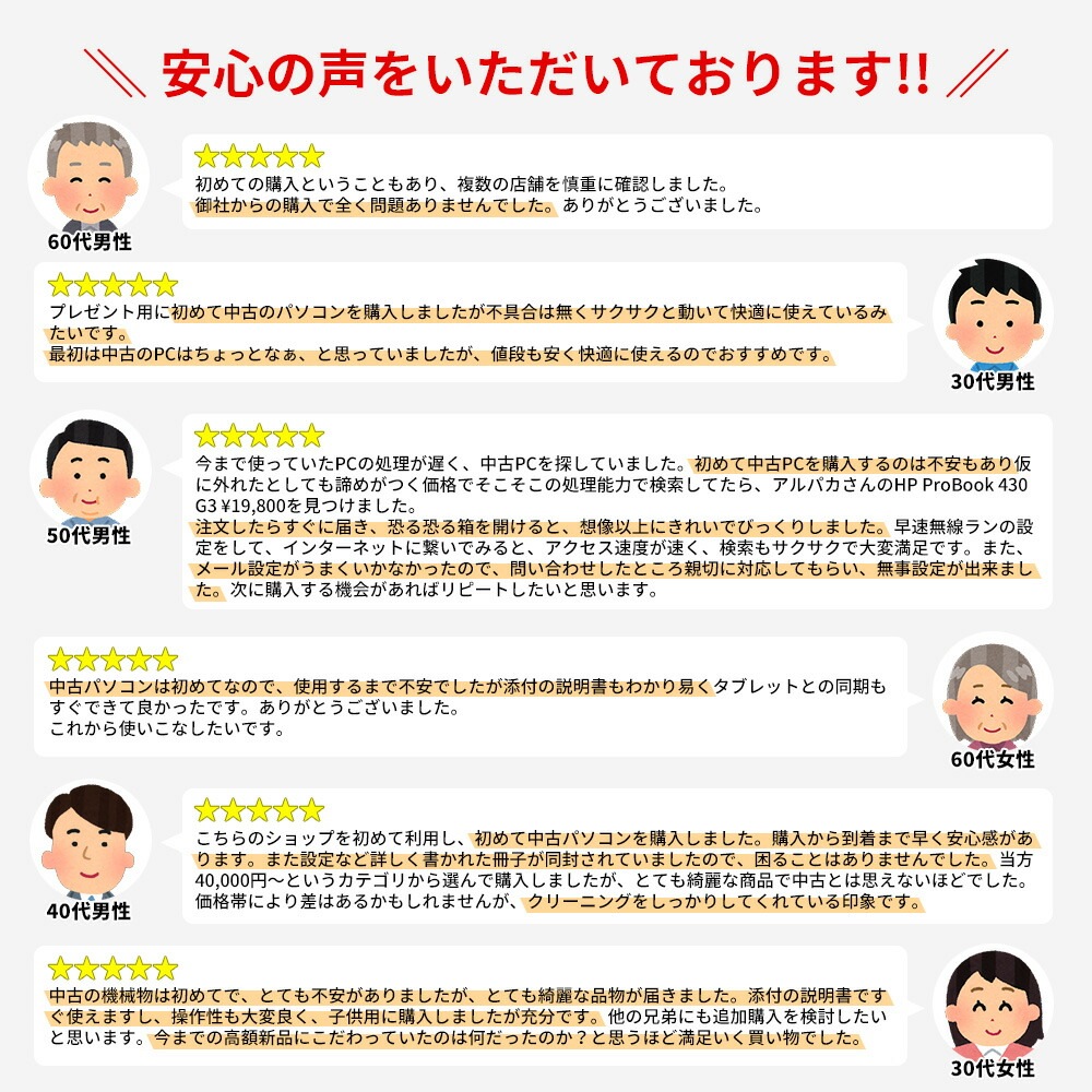 | ご注意 | ・中古品のため、バッテリーは保証外となります。ACアダプタを接続してご使用ください。 ・本体に擦り傷や日焼けなど多少の使用感がございます。 ・OSは中古PC再生用にインストールされたものであり、メーカー出荷時とは内容が異なります。 |