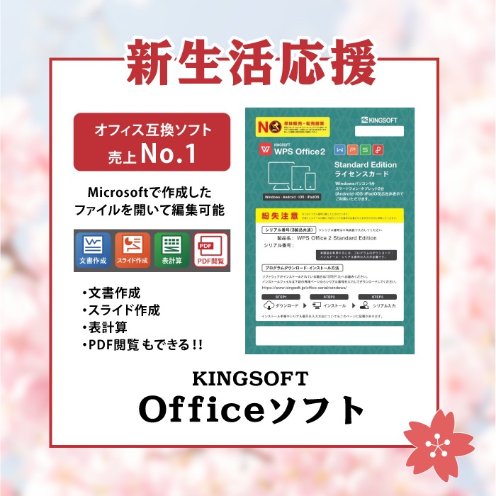 | 付属オフィス | KINGSOFT キングソフト WPS Office Microsoft (マイクロソフト) Officeとの高い互換性を持つ オフィスソフト です! ※同梱のライセンスカードにて認証を行ってください。 |