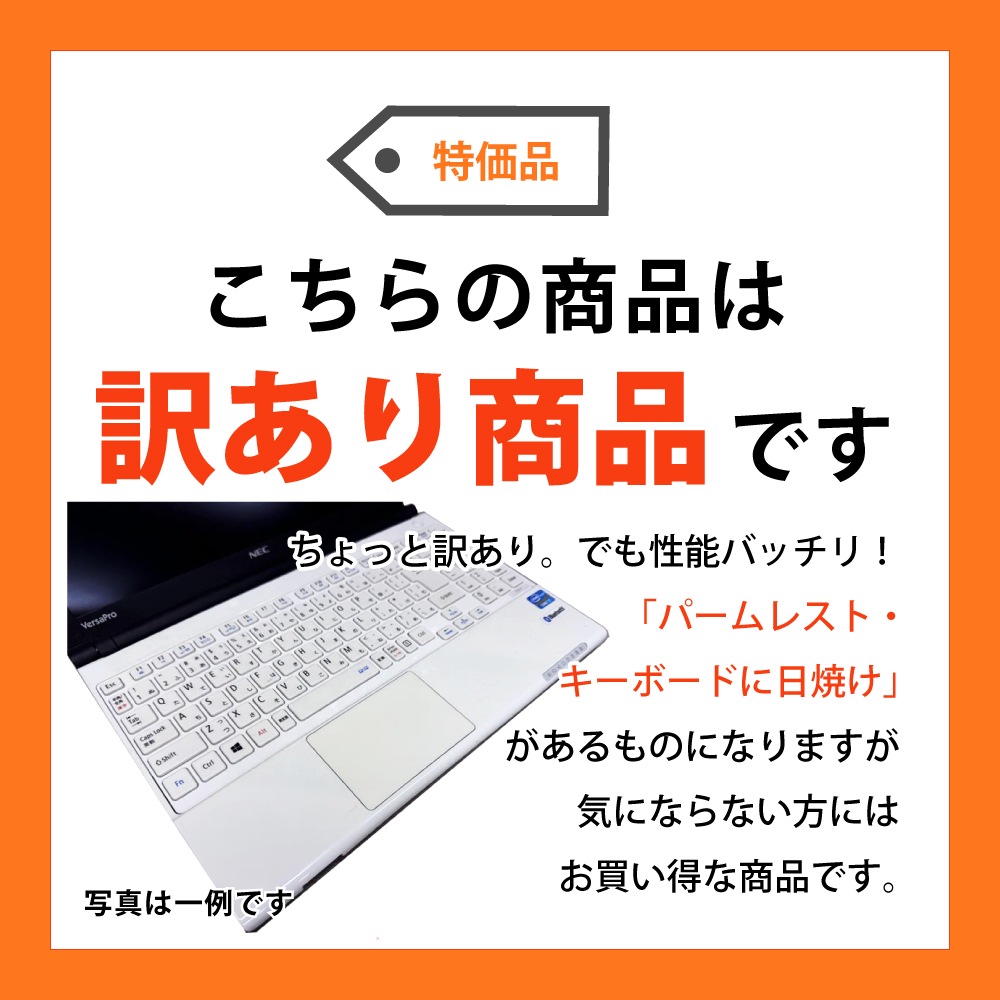 | ご注意 | ・パームレスト・キーボードに日焼けがあります。 ・中古品のため、バッテリーは保証外となります。ACアダプタを接続してご使用ください。 ・本体に擦り傷や日焼けなど多少の使用感がございます。 ・OSは中古PC再生用にインストールされたものであり、メーカー出荷時とは内容が異なります。 |