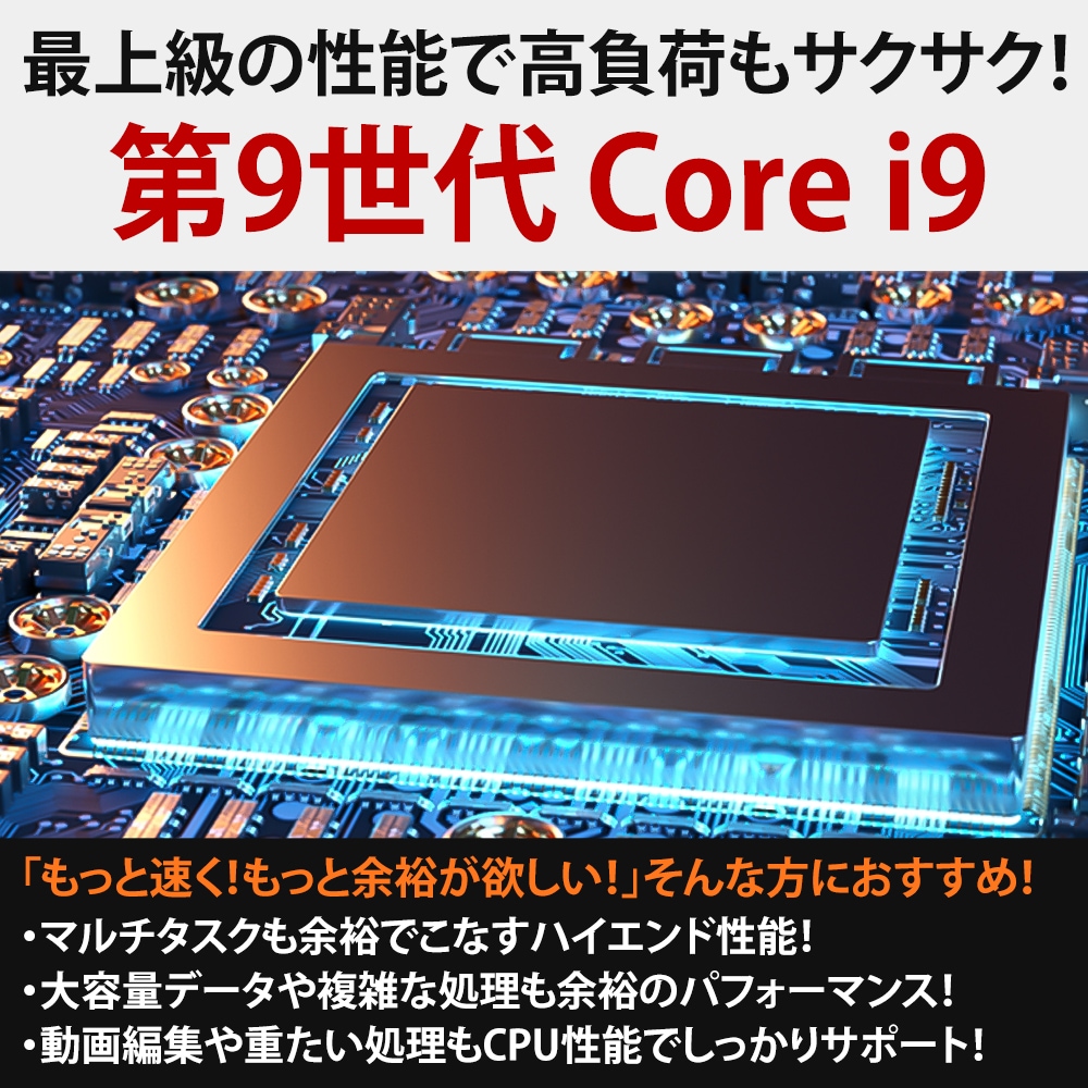 | CPU | Intel Core i9 9900 3.1GHz ターボ・ブースト利用時の最大周波数:5.0GHz 第9世代 Coffee Lake 8コア/16スレッド |