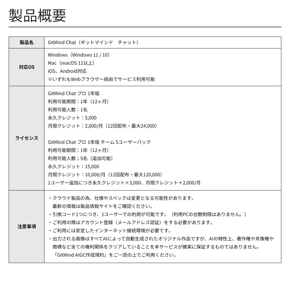 | 注意事項 | ・クラウド製品の為、仕様やスペックは変更となる可能性があります。最新の情報は製品情報サイトをご確認ください。 ・引換コード1つにつき、1ユーザーでの利用が可能です。(利用PCの台数制限はありません。) ・ご利用の際はアカウント登録(メールアドレス認証)をする必要があります。 ・ご利用には安定したインターネット接続環境が必要です。 ・出力される画像はすべてAIによって自動生成されたオリジナル作品ですが、AIの特性上、著作権や肖像権や商標など全ての権利関係をクリアしていることを本サービスが確実に保証するものではありません。「GitMind AIGC作成規約」をご一読の上でご利用ください。 |
