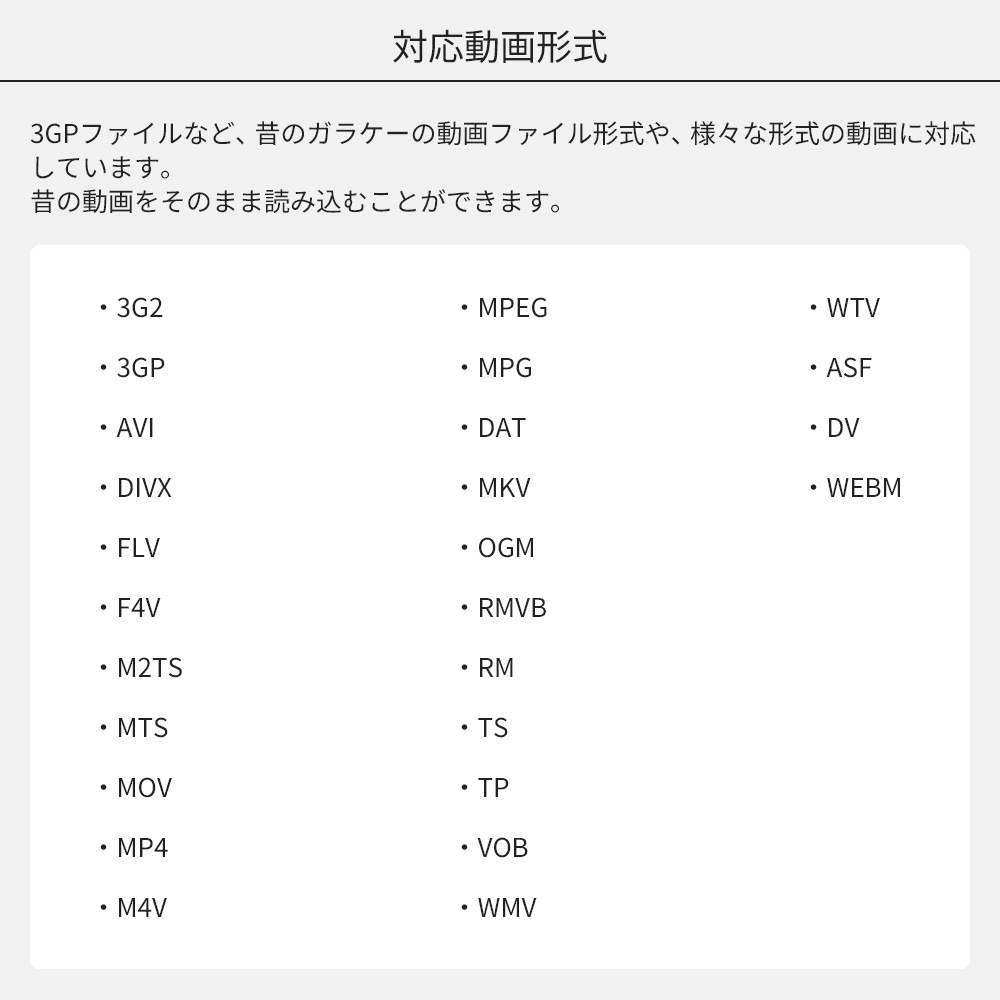 | 入力フォーマット | 3G2、3GP、AVI、DIVX、FLV、F4V、M2TS、MTS、MOV、MP4、M4V、MPEG、MPG、DAT、MKV、OGM、RMVB、RM、TS、TP、VOB、WMV、WTV、ASF、DV、 WEBM |
