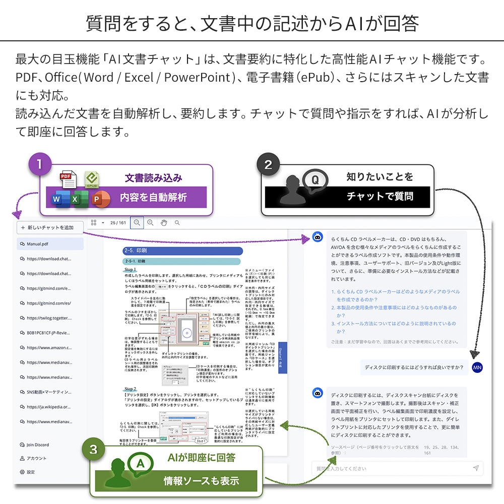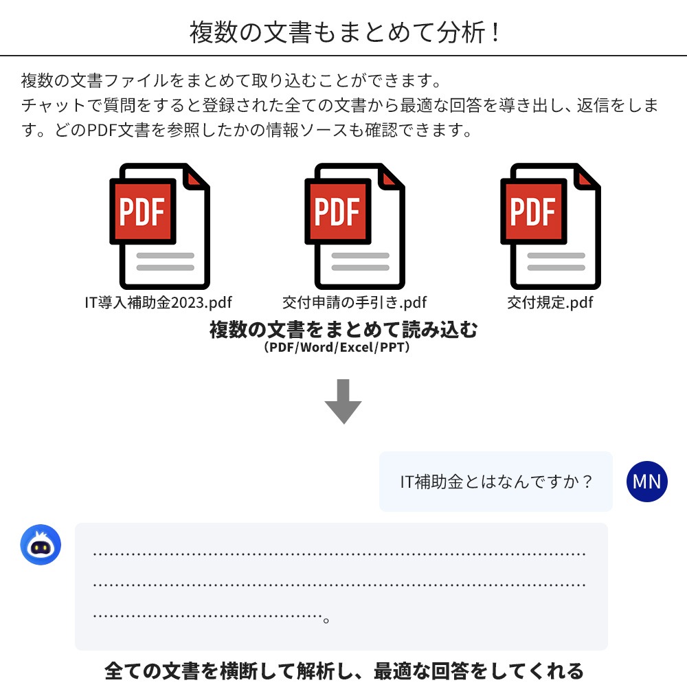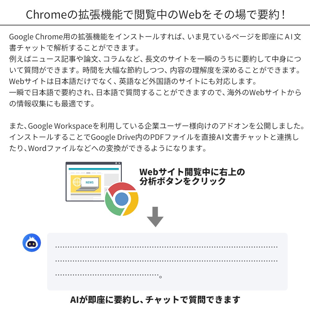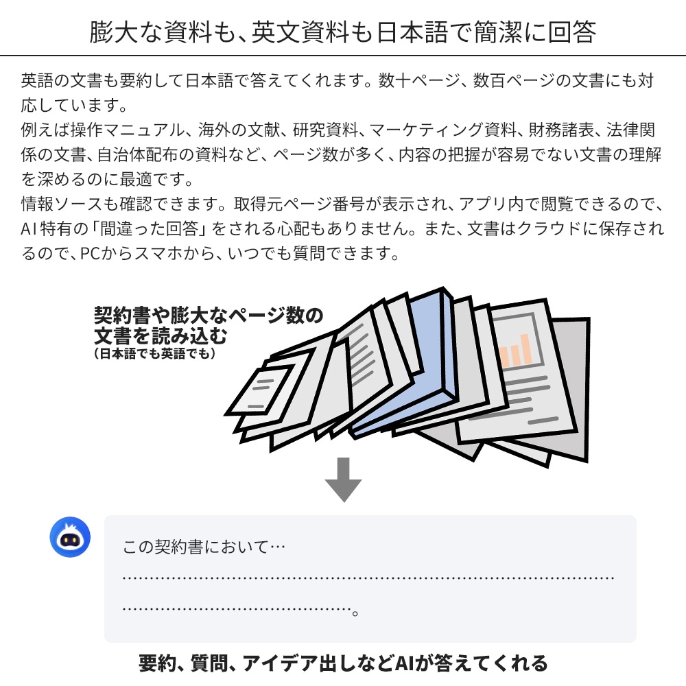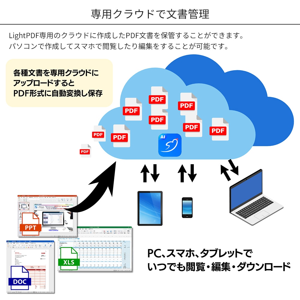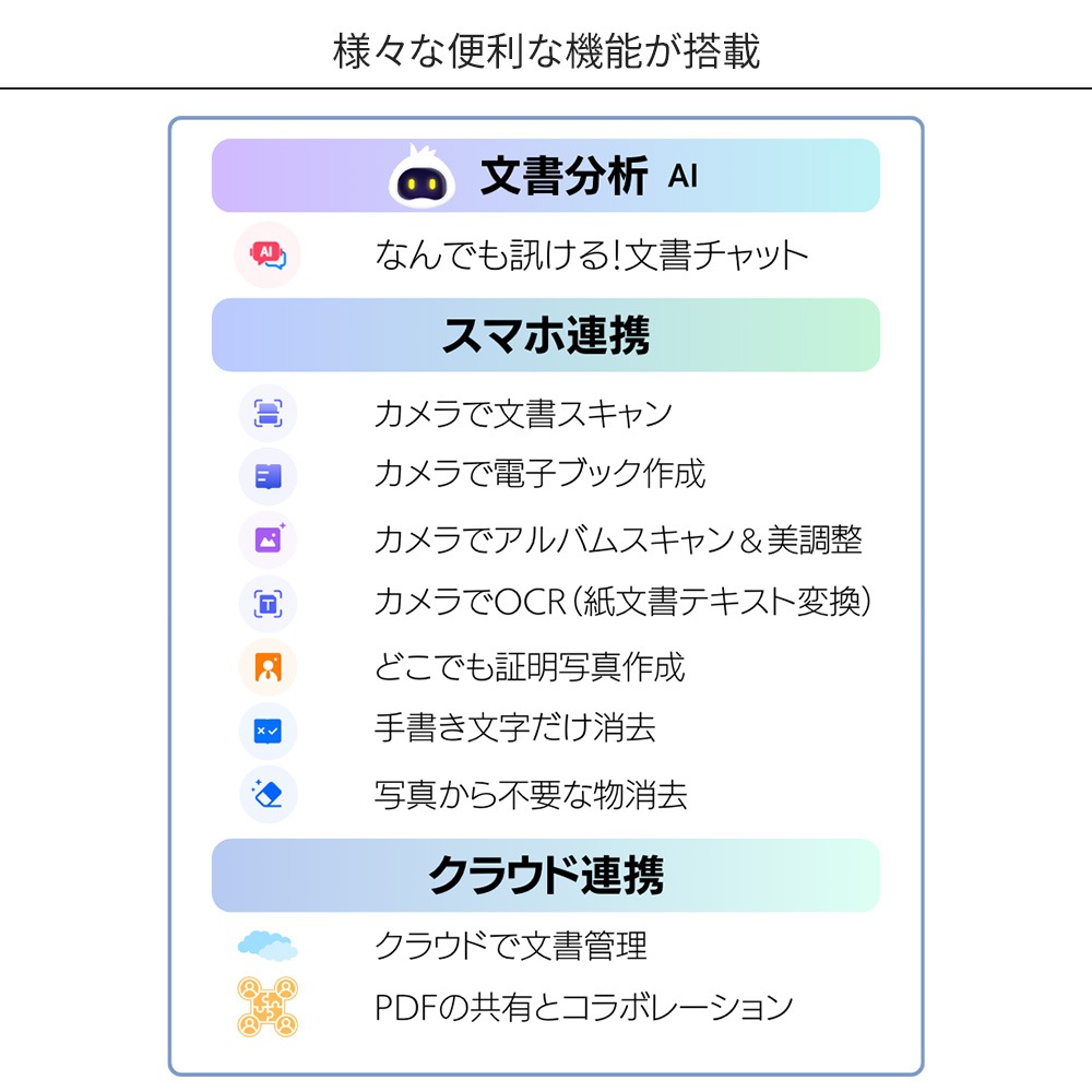 | 対応形式 | ・AI文書チャット pdf / docx / doc / xlsx / pptx / epub ・PDFに変換 docx / doc / pptx / ppt / xlsx / xls / png / jpg / cad ・PDFから変換 docx / pptx / xlsx / png / jpg / txt |