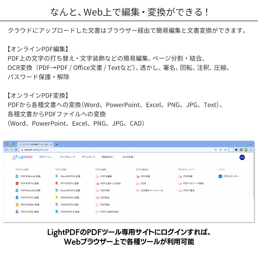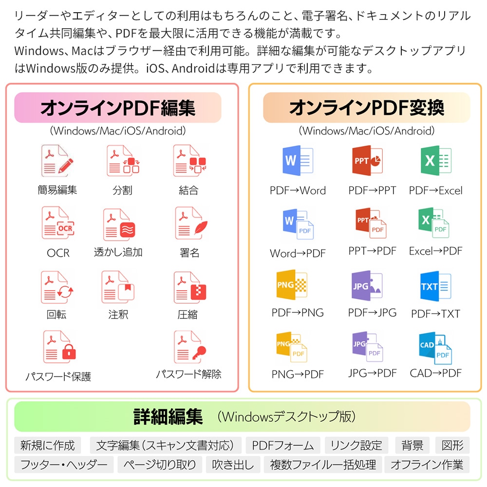 | 注意事項 | ※クラウド製品の為、仕様やスペックは変更となる可能性があります。 ※ローカルで動作するデスクトップアプリはWindows版のみの提供です。MacではWebブラウザのみのご利用となります。 ※デスクトップアプリのインストールには、管理者権限での実行が必要です。 ※引換コード1つにつき、1ユーザーでの利用が可能です。(利用PCの台数制限はありません。) ※ご利用の際はアカウント登録(メールアドレス認証)をする必要があります。 ※インストール、引換コードの認証、データの同期、クラウドの利用やブラウザーからの利用には安定したインターネット接続環境が必要です。 ※スマートフォンでのご利用の際は「LightPDF」アプリ(無料)をAppStoreまたはGoogle Playストアからインストールします。 ※期間終了後の継続利用の際はお買い求めの販売サイトにて追加のライセンス(アクティベーションコード)をご購入ください。(利用期限を迎える前に追加登録も可能です。終了予定日からライセンス日数分が加算されます) |