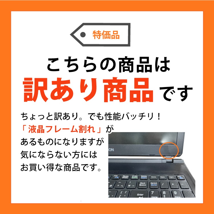 | ご注意 | ・液晶フレーム割れがあります。 ・中古品のため、バッテリーは保証外となります。ACアダプタを接続してご使用ください。 ・本体に擦り傷や日焼けなど多少の使用感がございます。 ・OSは中古PC再生用にインストールされたものであり、メーカー出荷時とは内容が異なります。 |