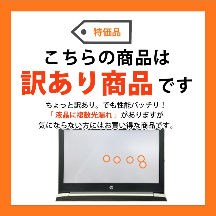 | ご注意 | ・液晶に複数液晶漏れがあります。 ・中古品のため、バッテリーは保証外となります。ACアダプタを接続してご使用ください。 ・本体に擦り傷や日焼けなど多少の使用感がございます。 ・OSは中古PC再生用にインストールされたものであり、メーカー出荷時とは内容が異なります。 |