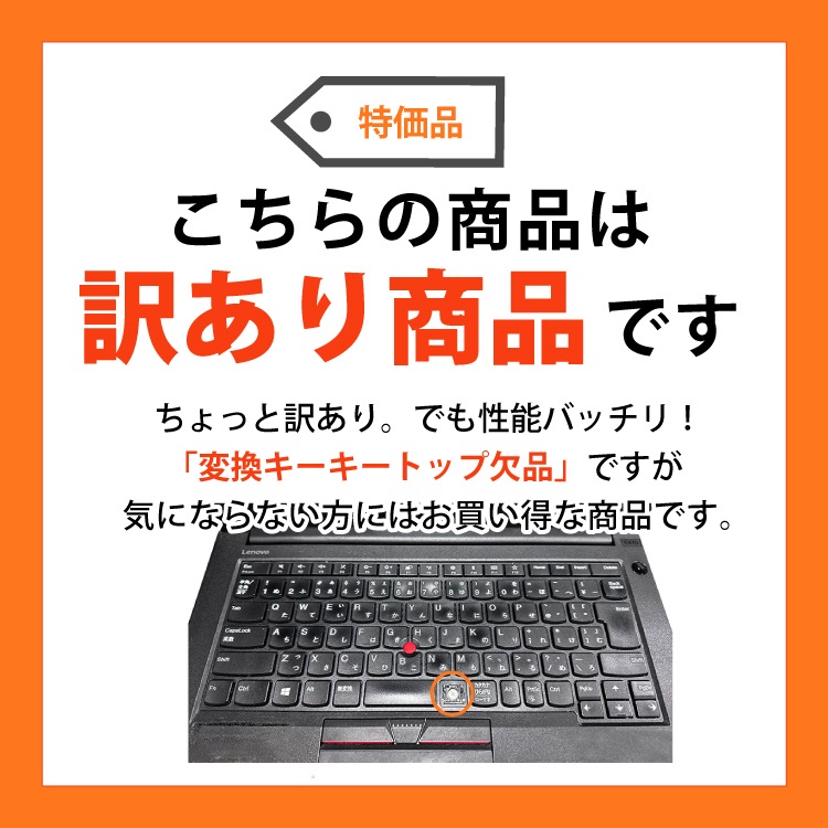 | ご注意 | ・変換キーキートップが欠品しています。 ・中古品のため、バッテリーは保証外となります。ACアダプタを接続してご使用ください。 ・本体に擦り傷や日焼けなど多少の使用感がございます。 ・OSは中古PC再生用にインストールされたものであり、メーカー出荷時とは内容が異なります。 |