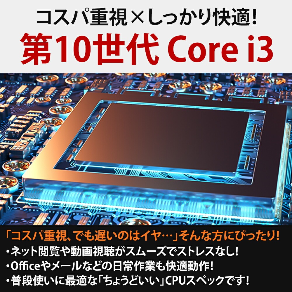 | CPU | Intel Core i3 1005G1 1.2GHz ターボ・ブースト利用時の最大周波数:3.4GHz 第10世代 Ice Lake 2コア/4スレッド |
